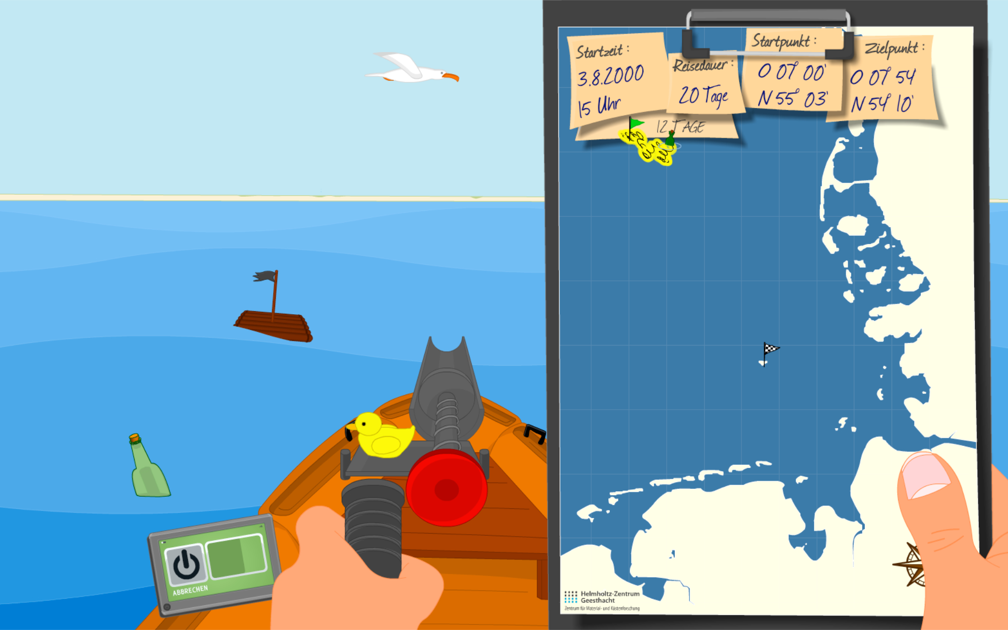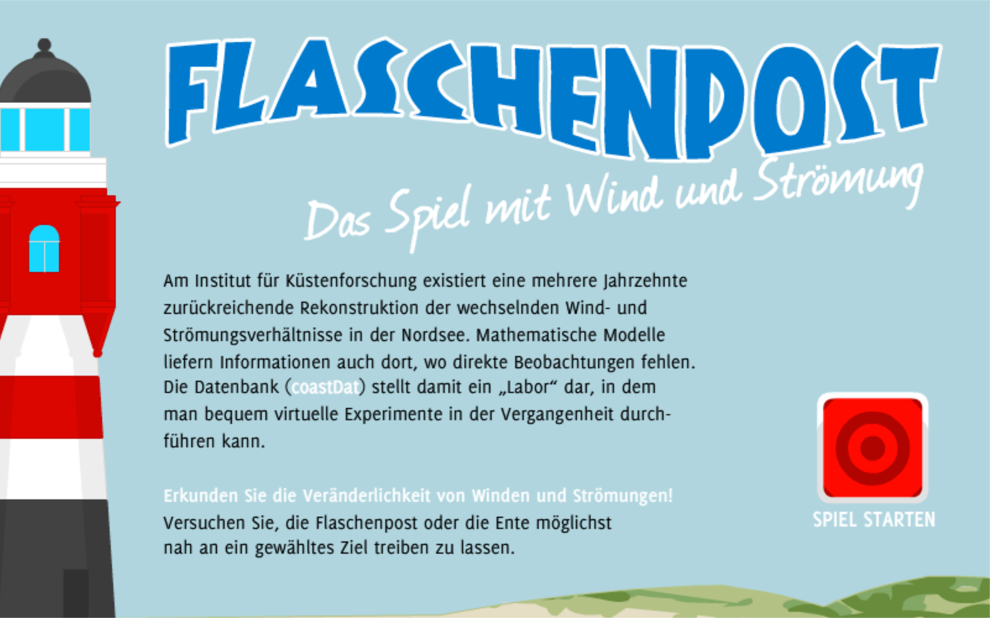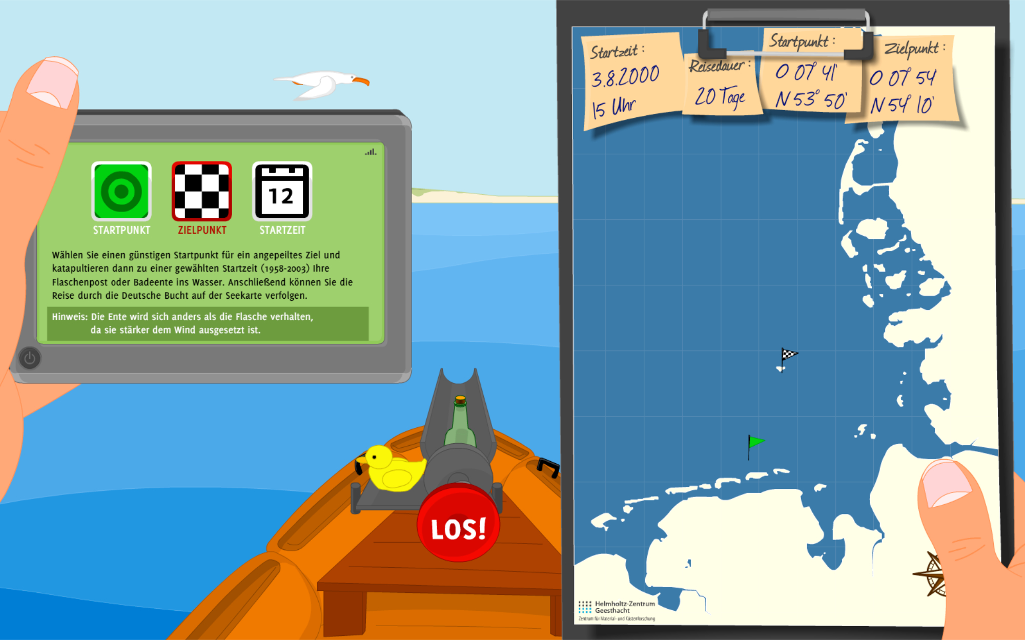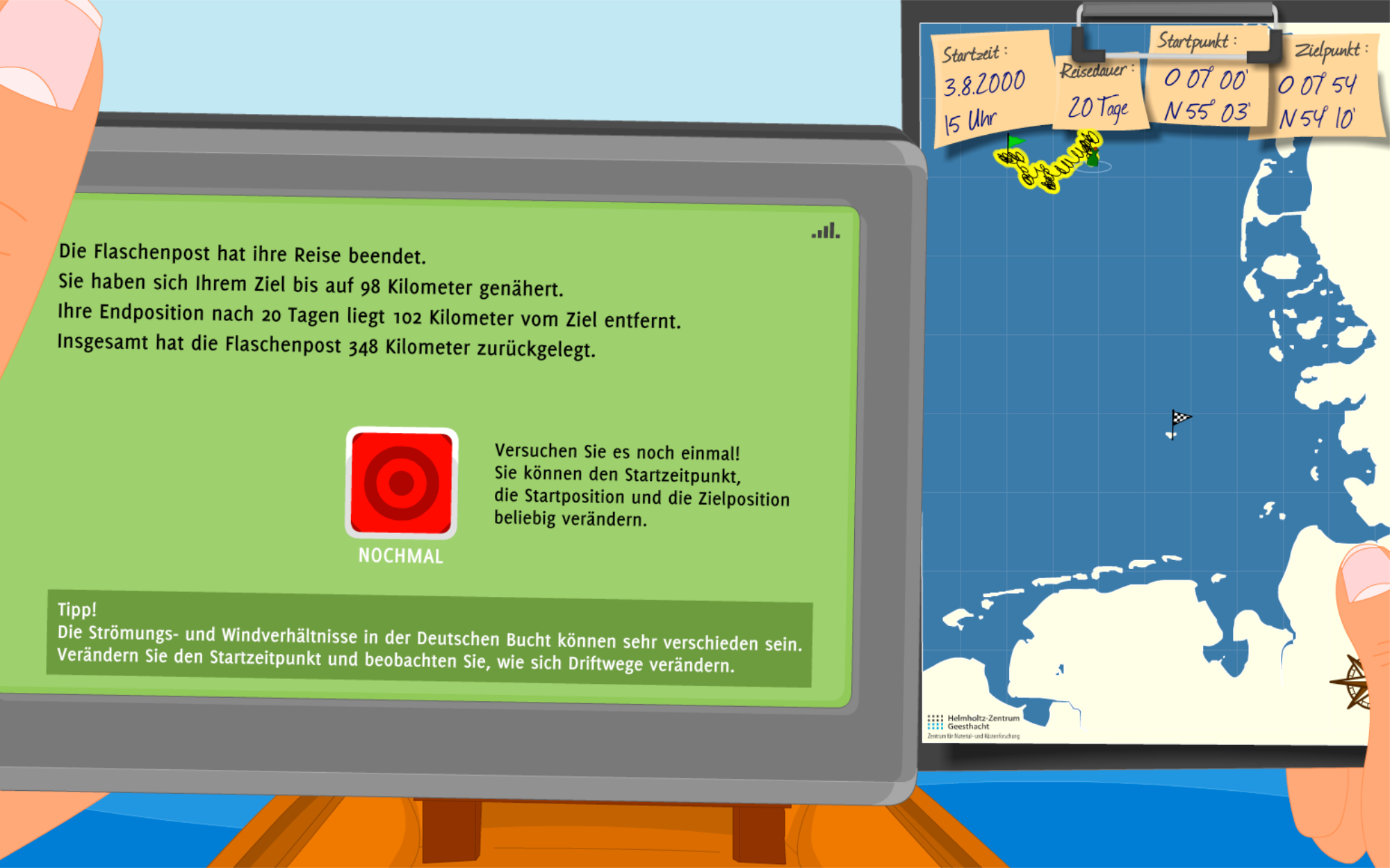 Das Helmholtz-Zentrum Hereon (HZH) informiert mit einem spannenden Wissenschaftsspiel über die Ergebnisse des Instituts für Küstenforschung. Mithilfe von Mess-Bojen, Forschungsschiffen, Beobachtungssatelliten und Radaranlagen erfassen Wissenschaftler:innen des HZH seit über 40 Jahren unter anderem die Fließgeschwindigkeit, Wassertemperatur und Wellenhöhe der Nordsee. Diese und weitere Messdaten werden ausgewertet, um daraus Computermodelle zu entwickeln, die die Meeresströmung früher, heute und in der Zukunft zeigen. Damit lässt sich zum Beispiel bestimmen, welche Küstengebiete im Falle einer Ölkatastrophe am dringlichsten geschützt werden müssen, wie sich künftige Sturmfluten auswirken könnten - oder aber wohin eine Flaschenpost treibt, die an einem beliebigen Punkt der Nordsee ins Wasser geworfen wird.
