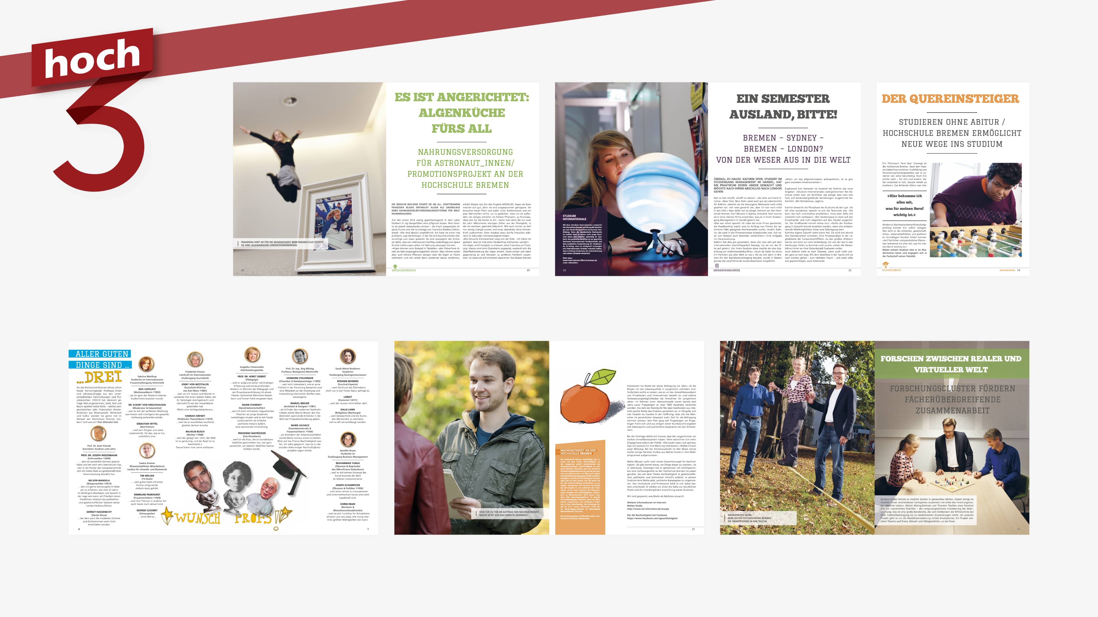 Unter dem Dach der Hochschule Bremen gibt es jede Menge spannende Geschichten - in Hoch3 werden sie erzählt. Für die Hochschule haben wir ein liebevoll gestaltetes Wissensmagazin realisiert, dass mit spannenden Reportagen und Porträts die Menschen und Projekte an der Hochschule vorstellt.