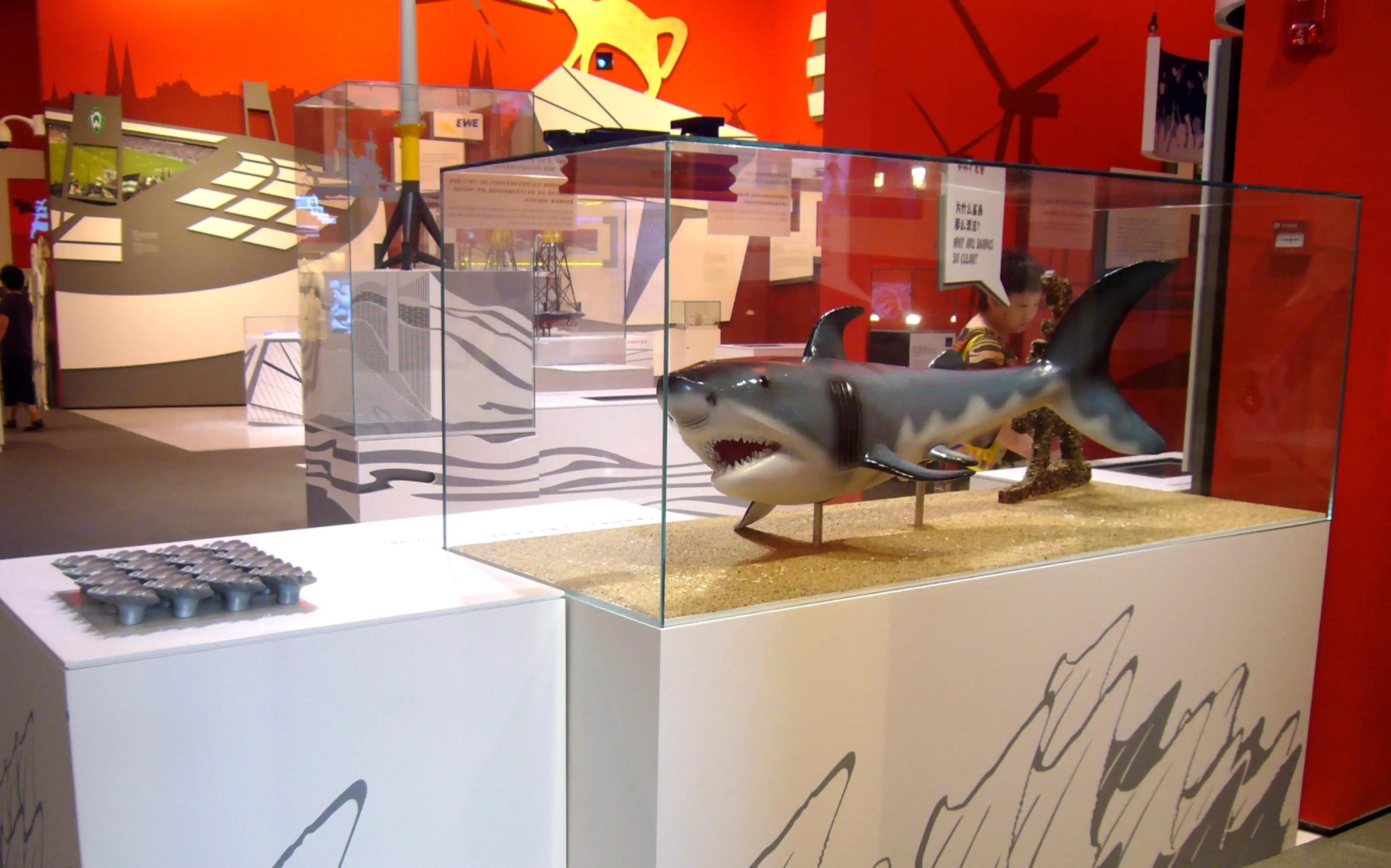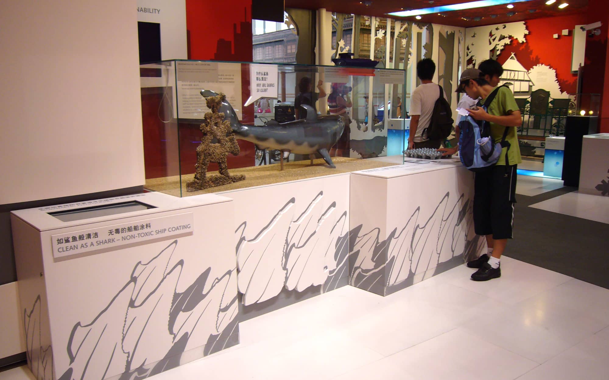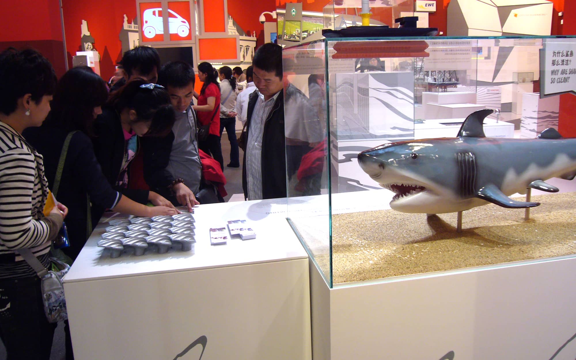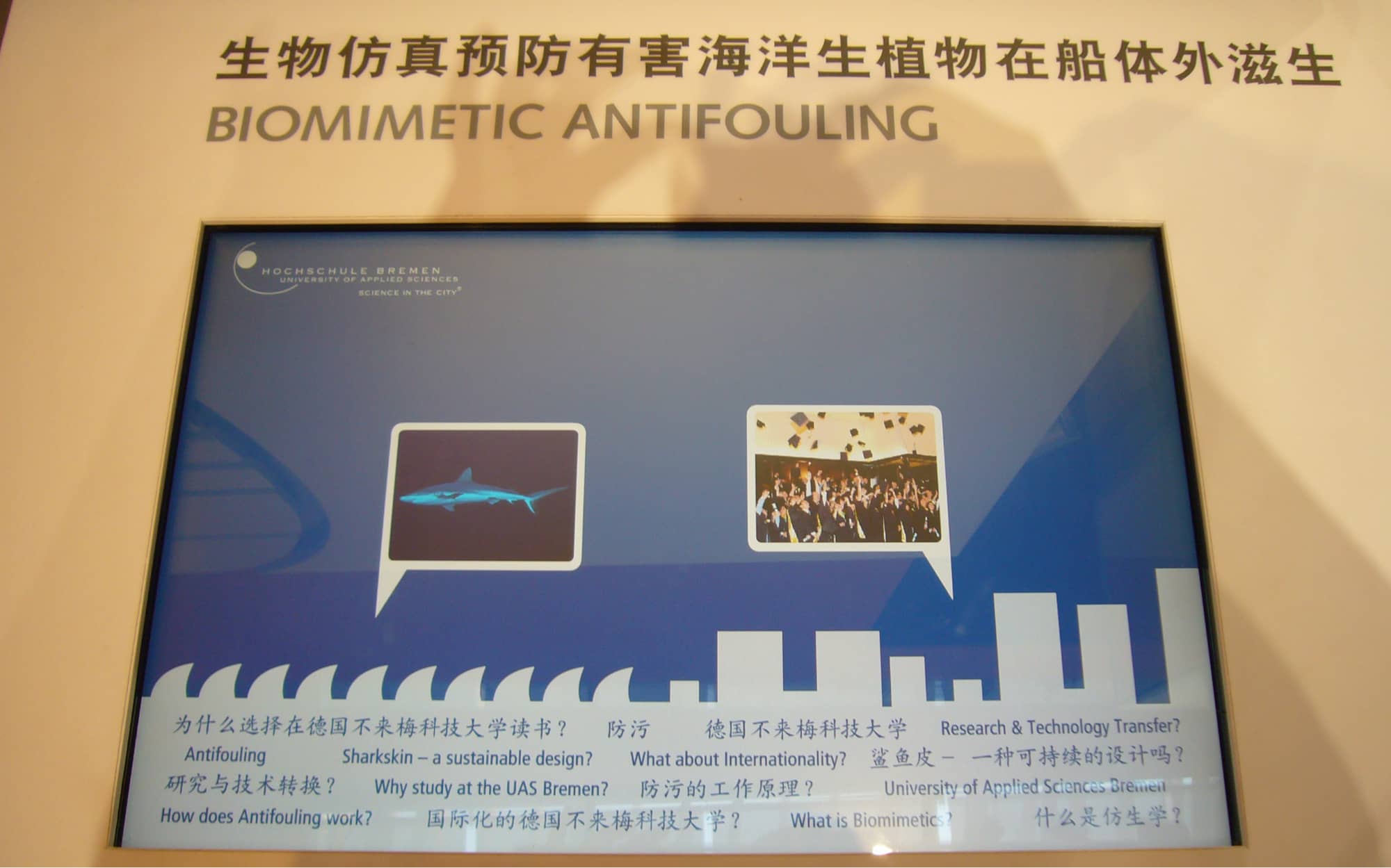 Vom 1. Mai bis 31. Oktober 2010 fand in der Millionen-Metropole am Yangzi die Weltausstellung statt. „City of Innovation“ – so lautet das Motto des Bremer Messestandes im Deutschen Pavillon. Hier präsentiert sich das kleinste Bundesland mit einem Füllhorn innovativer Forschungsergebnisse für eine klimafreundliche Zukunft. Als eine der zentralen Forschungseinrichtungen des Landes Bremen legt die Hochschule Bremen in diesem Zusammenhang einen besonderen Fokus auf die Bionik und insbesondere die Forschungsarbeit zum Thema Antifouling. Ein thematisch gestalteter Exponattisch veranschaulicht die Forschungsarbeit rund um die künstliche Haihaut und daraus gewonnenen Erkenntnisse.
