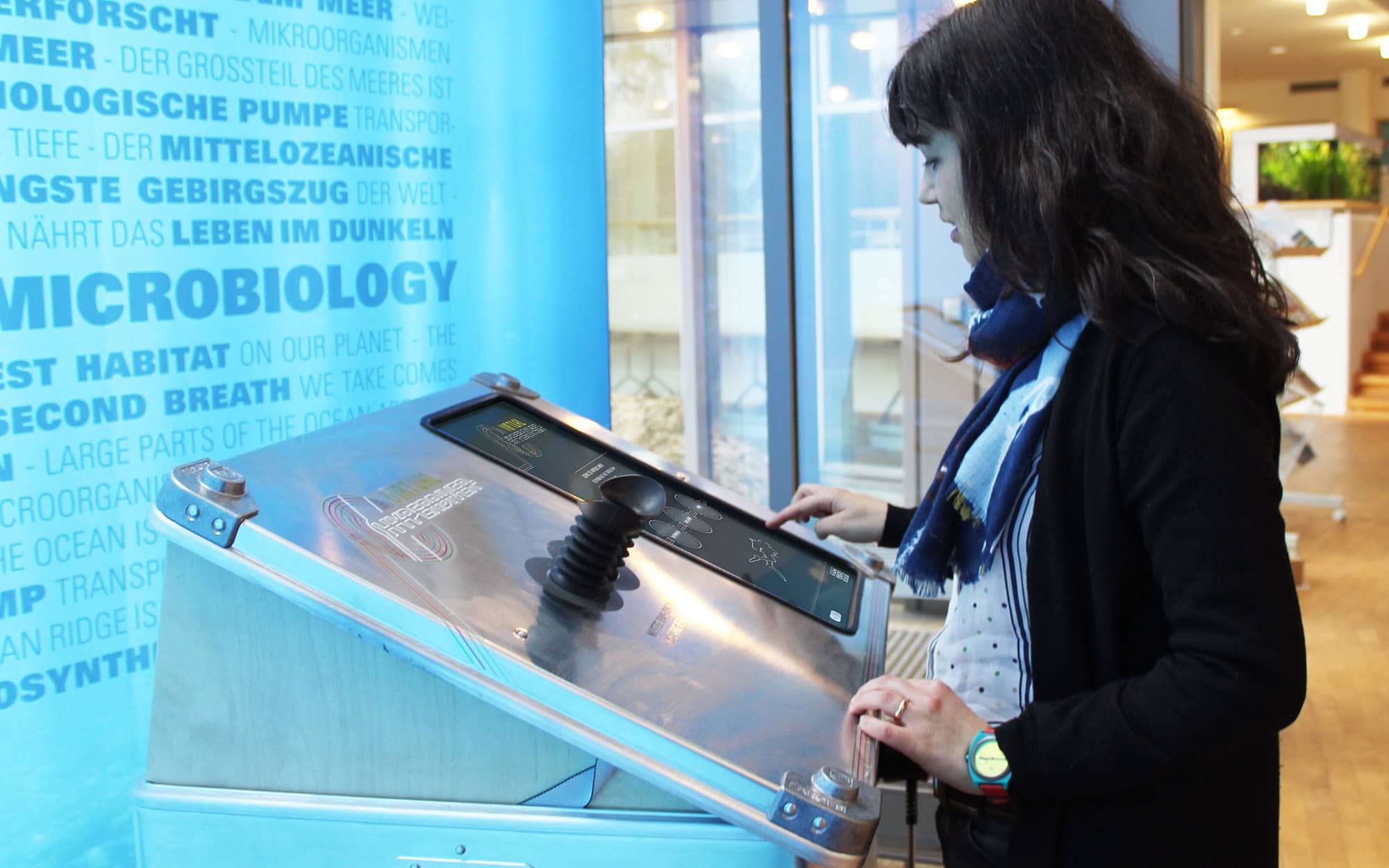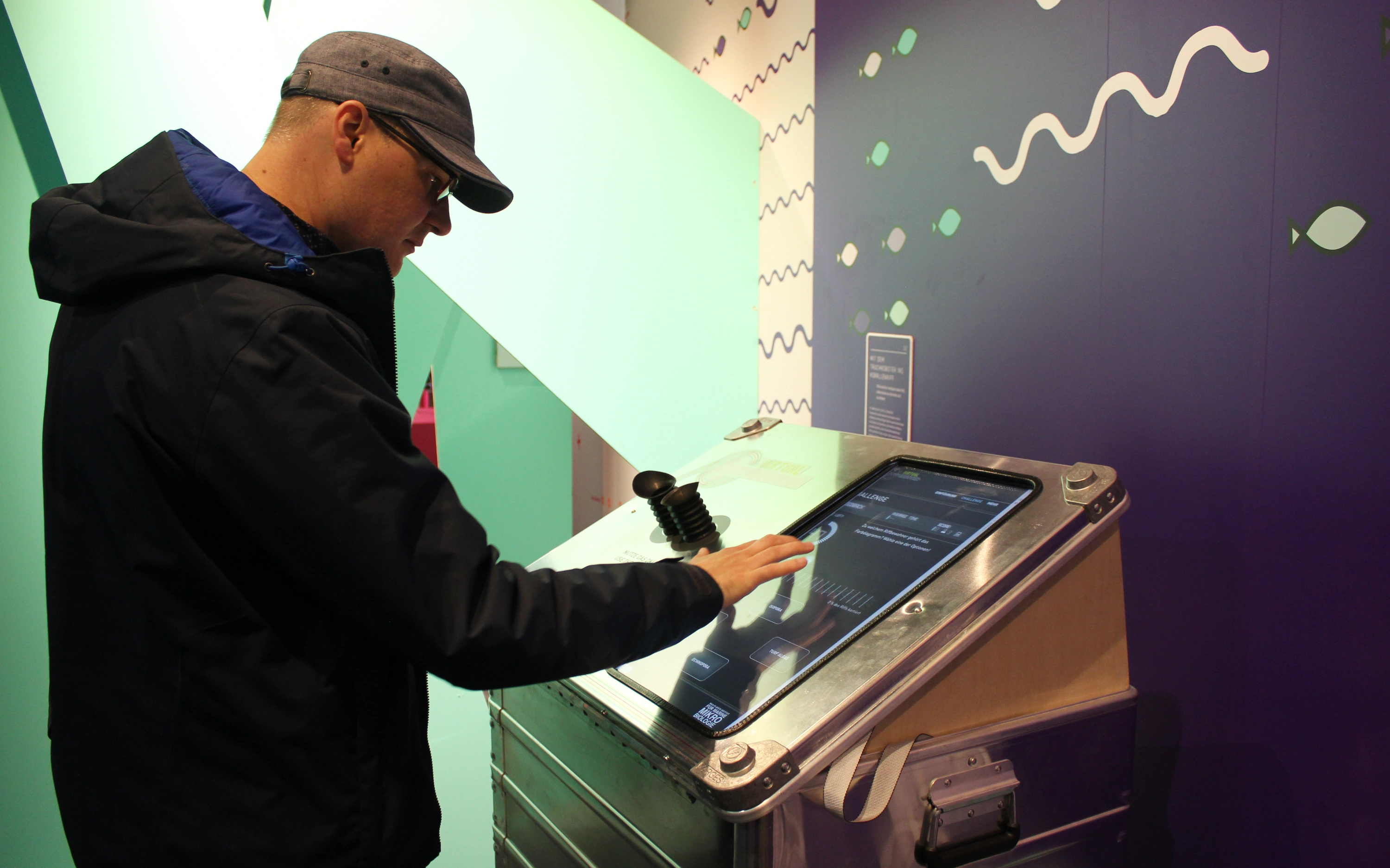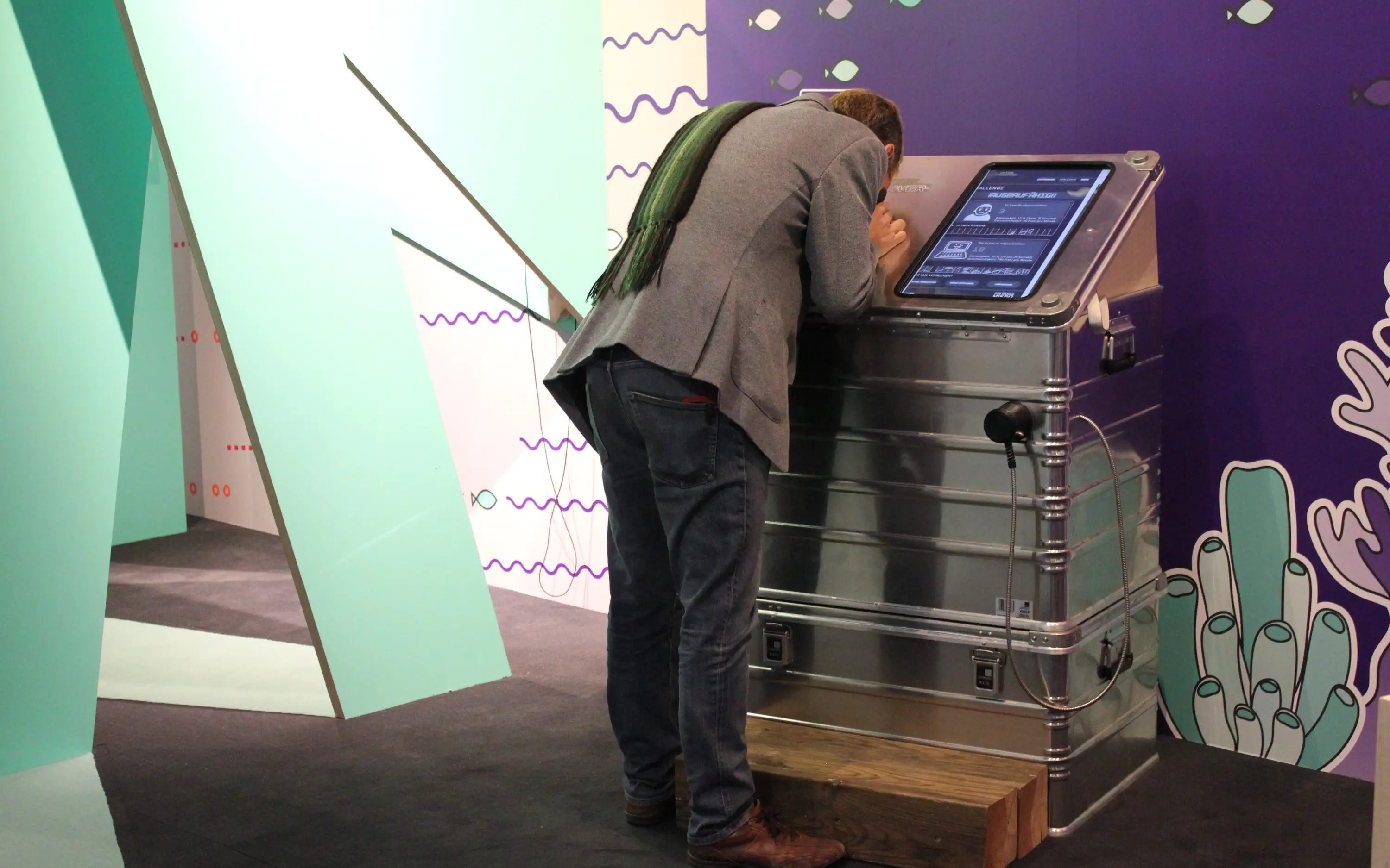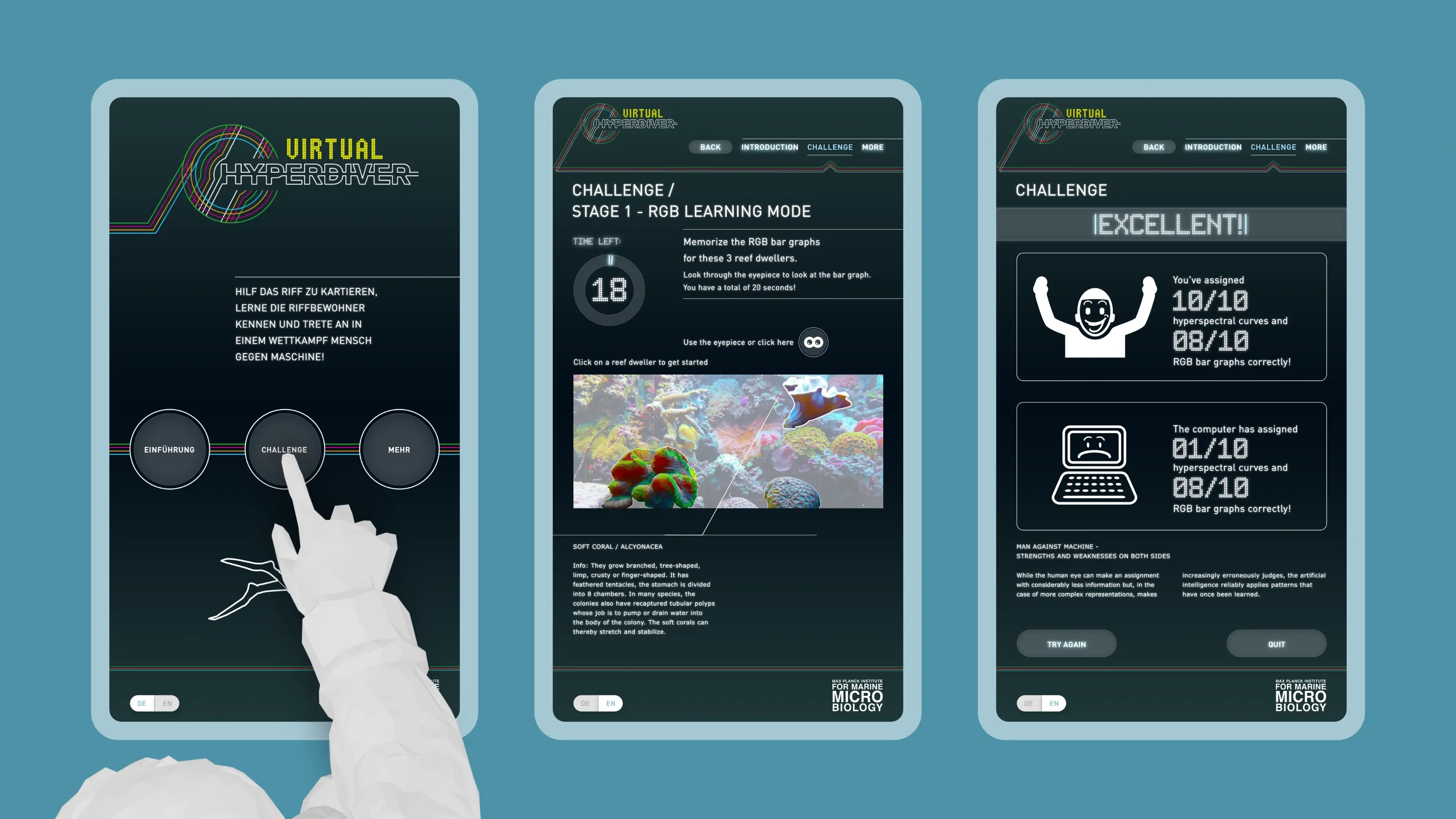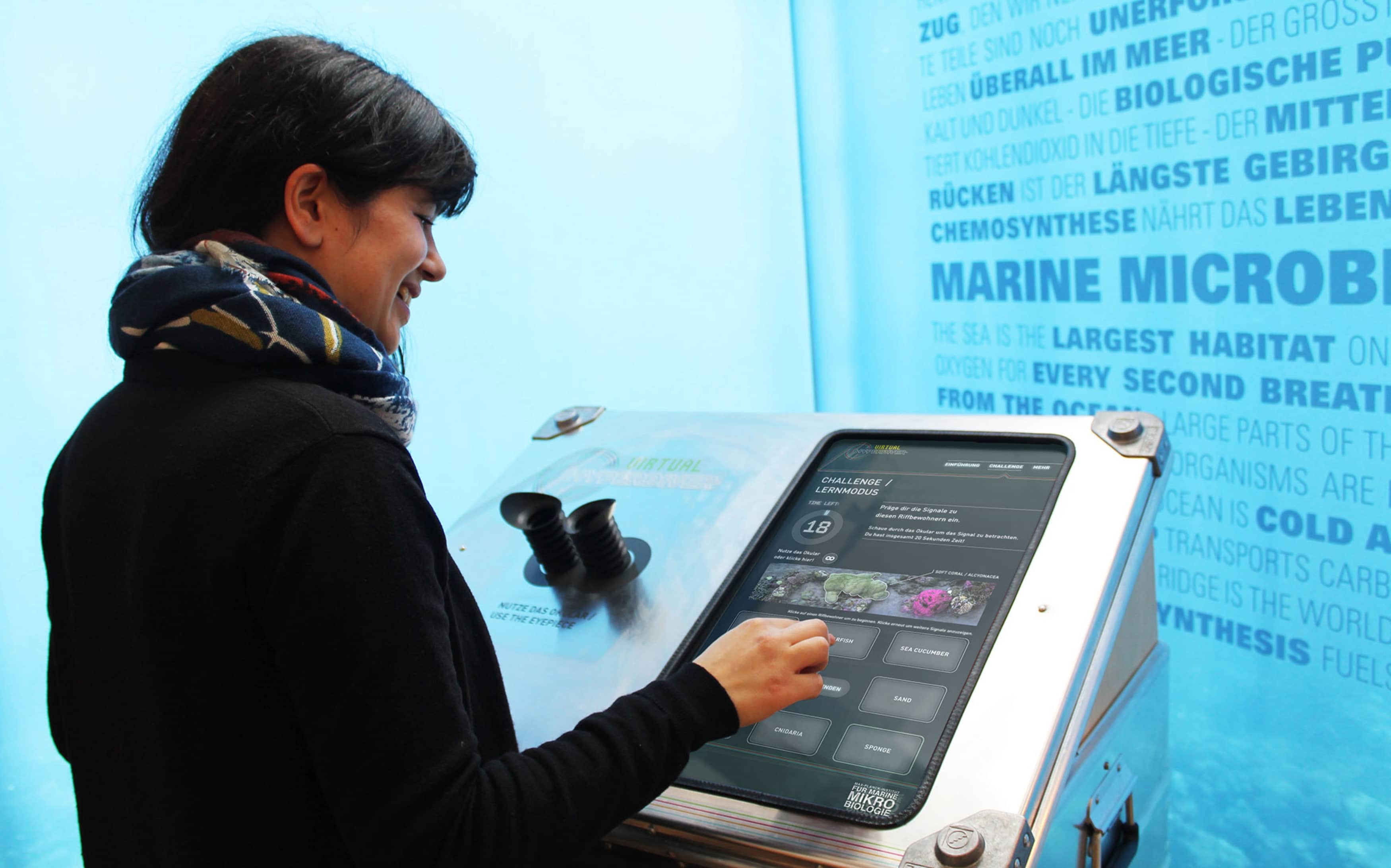 In einem spannenden Zuordnungsspiel gilt es die verschiedenen Riffbewohner wie Koralle, Seegurke und Alge nur anhand ihrer Farbdiagramme zu erkennen. Durch ein Okular prägen sich die Besucher:innen zunächst im Lernmodus die Farbspektren ein. In der Challenge kann dann unter Beweis gestellt werden, wie gut das eigene Zuordnungsvermögen unter Zeitdruck funktioniert. Die Besucher:innen treten dabei gegen die künstliche Intelligenz an: Wer in kurzer Zeit mehr Diagramme den richtigen Organismen zuordnet gewinnt.